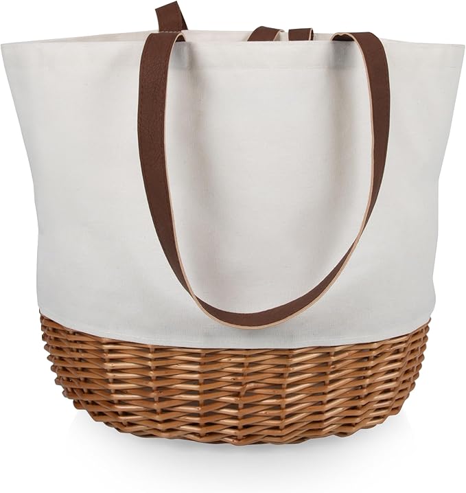 The bottom is designed with a reinforced faux-wicker texture that adds both visual appeal and practical stability, while the canvas top is lightweight, durable, and soft to the touch. Equipped with dual handles and shoulder straps, it can be carried by hand or worn over the shoulder, ensuring convenience and comfort during your outings.