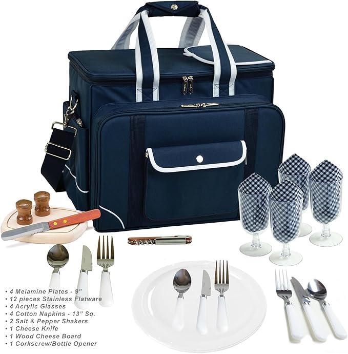 4-Person Insulated Picnic Cooler Bag Set | Portable Outdoor Picnic Backpack with Full Tableware, Glasses, Plates & Cutting Board
