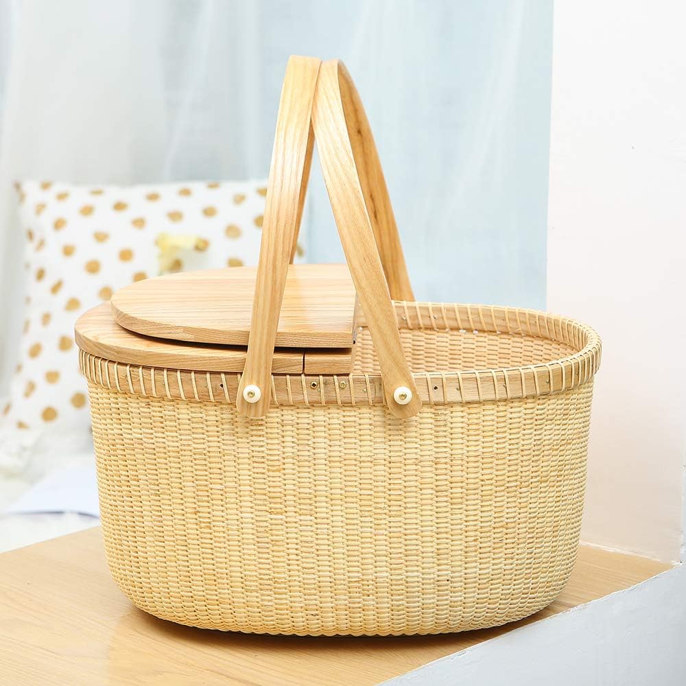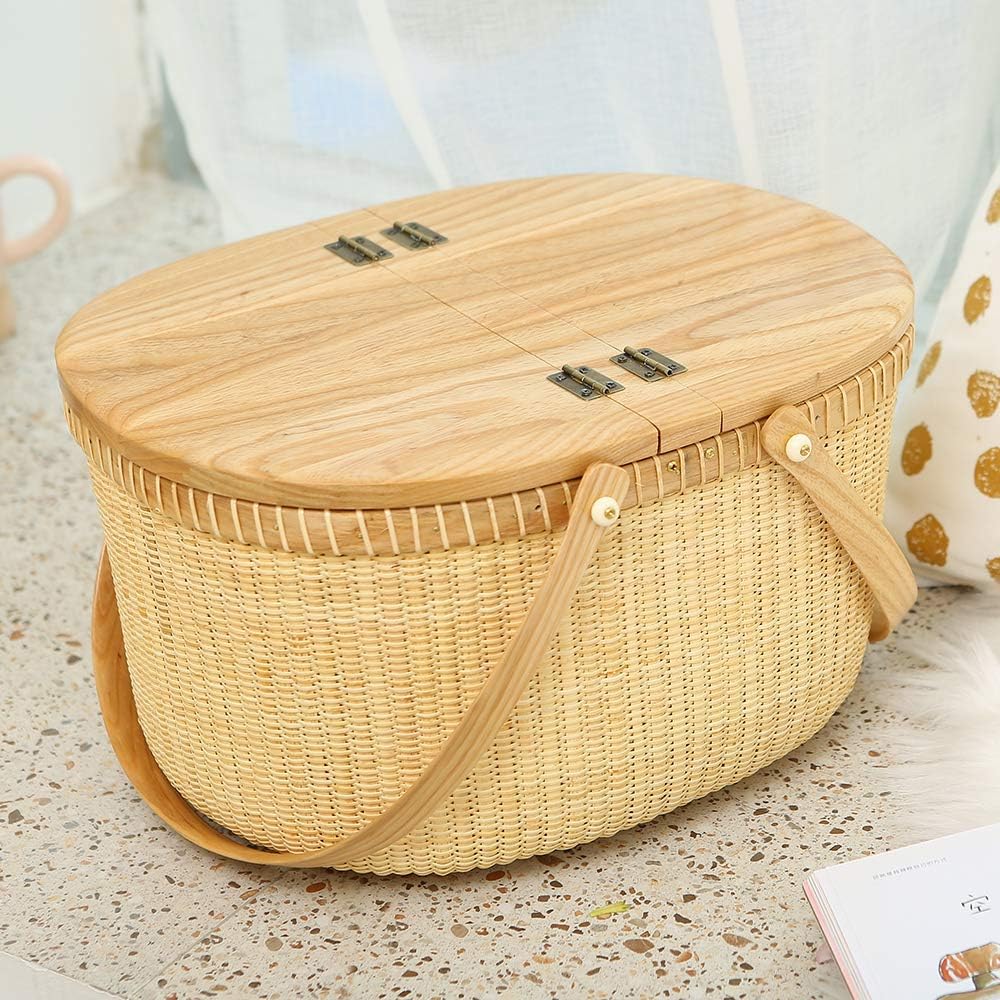 HIGH QUALITY MATERIAL: Large picnic basket is made from American hardwood and Cane staves finely-woven with cane weavers for strength and longevity, so it will withstand for Over a hundred years to come.Multiple coats of varnish are applied to protect, strengthen and bring out the natural beauty of the materials, It will develop a rich dark patina over the years with use.