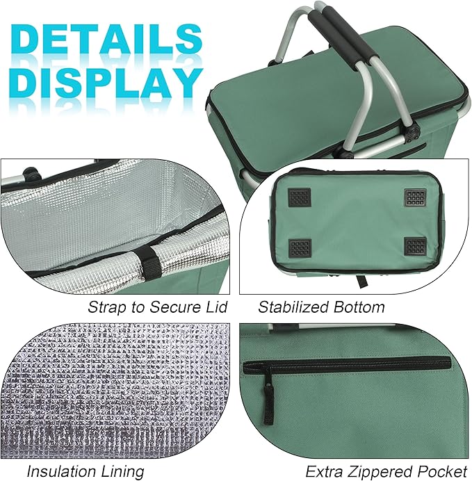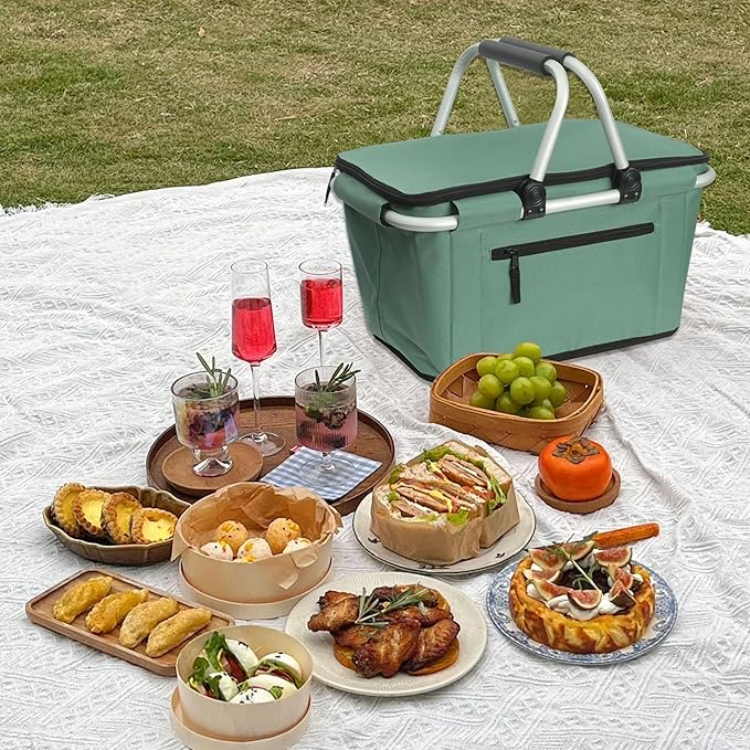Picnic basket, foldable shopping basket with handle, 27L large shopping basket with lid, reusable foldable shopping basket, insulated cooler bag, green