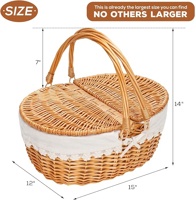 PERFECT BASKET SIZE: The empty picnic baskets measure 15" x 12" x 14" (including folding woven handles), with enough space to carry food for 2 people with a wine bottle or two.